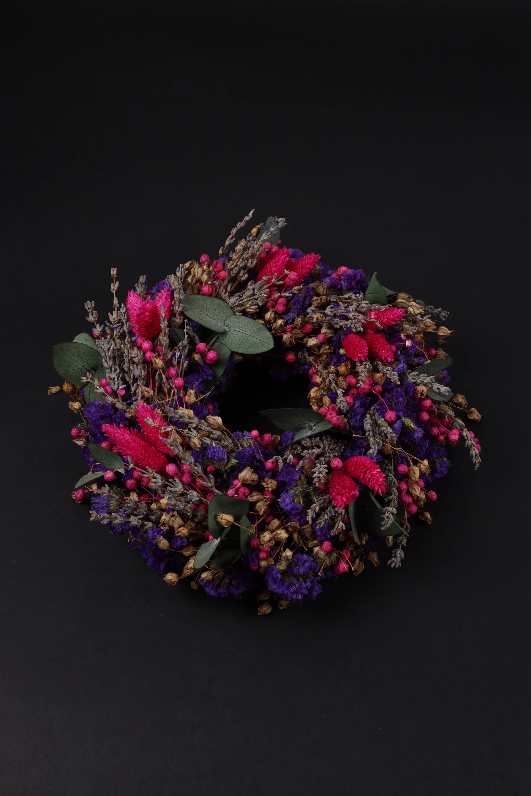 Description: Wreath statice sinuata, phalaris, lavendel, eukalpytus.